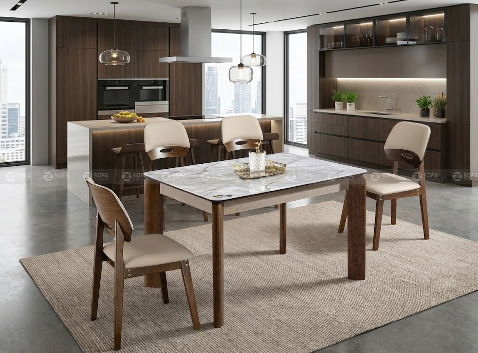 Điểm nổi bật của sản phẩm nằm ở mặt bàn đá nhân tạo cao cấp, có độ bóng đẹp tự nhiên, khả năng chống trầy, chống thấm và chịu nhiệt tốt. Nhờ bề mặt đá đồng nhất và dễ vệ sinh, bộ bàn ăn giúp giữ được vẻ mới mẻ trong suốt quá trình sử dụng, đồng thời tạo điểm nhấn sang trọng cho phòng ăn của gia đình.