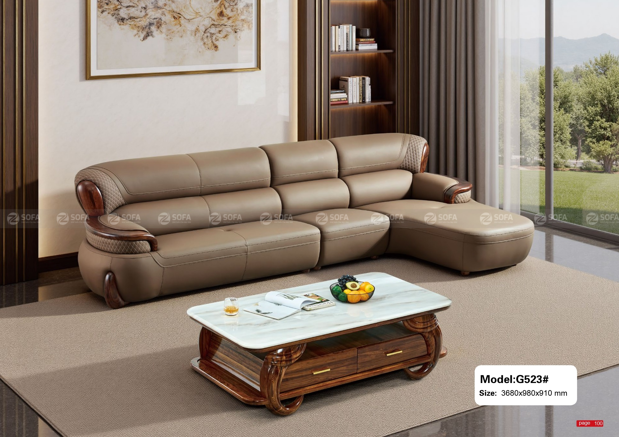 Mẫu sofa ZS5127 sở hữu phong cách sang trọng, kết hợp giữa chất liệu gỗ mun tự nhiên và đường nét bọc da mềm mại. Thiết kế kích thước lớn ~3.8m x 1.7m, tạo điểm nhấn ấn tượng cho phòng khách rộng, đặc biệt phù hợp với không gian biệt thự hoặc căn hộ theo phong cách hiện đại – bán cổ điển.